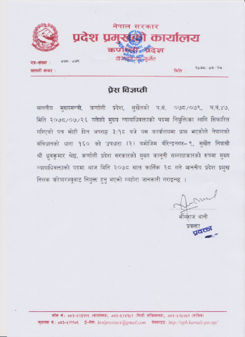 कर्णाली प्रदेश, २८ कार्तिक । कर्णाली प्रदेश सरकारका नवनियुक्त मुख्यन्यायाधिवक्ता ध्रुवकुमार श्रेष्ठले पद तथा गोपनियताको शपथ गरेका छन् । उच्च अदालत सुर्खेतका न्यायाधीश शेषराज शिवाकोटीबाट नवनियुक्त मुख्यन्यायाधिवक्ता श्रेष्ठले आज पद तथा गोपनियताको शपथ गरेका हुन् ।